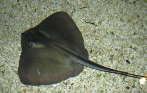 La pastinaca o chucho. ( Dasyatis pastinaca)..Es raro el año que en este caladero situado a milla y media de Torrevieja y en 30 m de sonda, no capturemos algun chucho de un par de kilos o mas, como éste que presento aquí bajo.No es comestible y por supuesto que lo liberamos. Es conveniente manipularlo con precaución dado el aguijón peligroso que tiene la base de la cola A su derecha un aguila marina que también capturamos aqui en otra ocasión