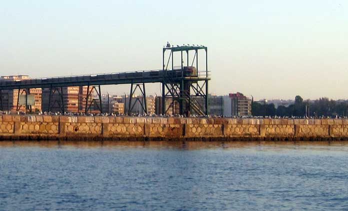 Imagen a la salida del puerto de Torrevieja en un dia de trabajo. Cientos de gaviotas esperan a los barcos de cerco, posadas en el dique de poniente. Pulse imagen para ampliar |
