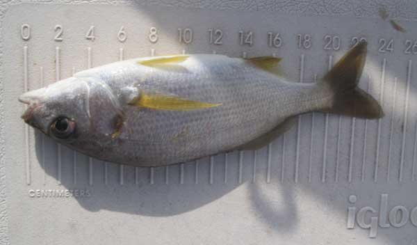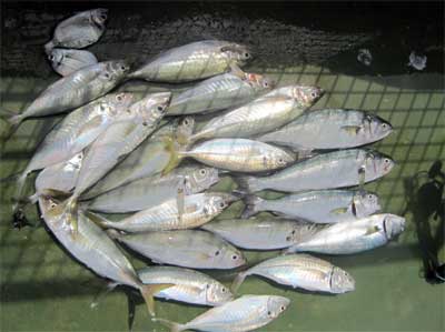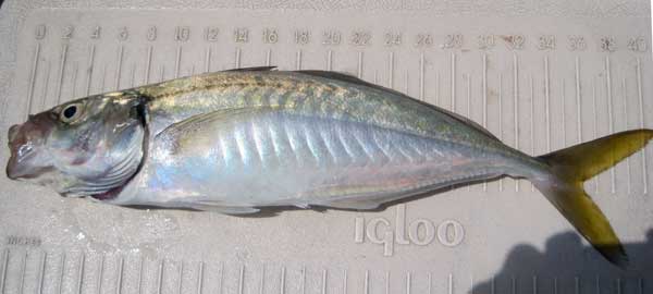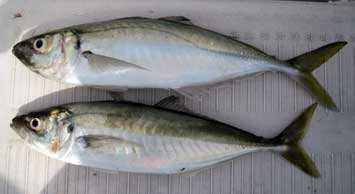 | En esta epoca, las sorelas ( Decapterus ronchus) se reúnen en puntos clave para frezar. La que presenta David, pese a su tamaño de cerca del kilo, es una hembra .El rostro de estas, es blanco, en contraste con el negruzco que presentan los machos especialmente en el morro y la mandibula inferior, (que recuerda a "un indivuduo mal afeitado y con barba negra") . Ver inmediatamente debajo |