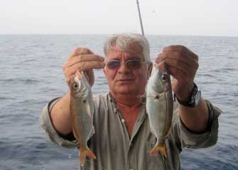 Bajo, el patrón Luis, logra la primera sorela ( Decapterus ronchus), subida a bordo del Gland, esta temporada. Por cierto , que ese día aunque las tanteamos a media agua , no dió resultado como otras veces.Bien es verdad , que no se vieron a media agua en la sonda. Los ejemplares que logramos, no muy abundantes, tenían 800 gr y 41 cm.