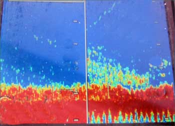 Bajo, una prometedora imagen en la sonda, con un fondo duro, con la presencia de mucho pescado de fondo. Había también gorgonias, como pudimos comprobar, al sacar algunas ramas de esta variedad de "coral blando". |