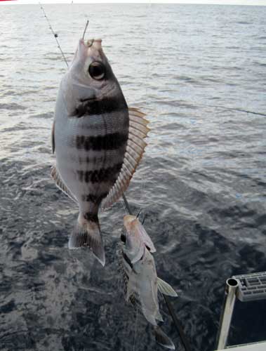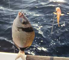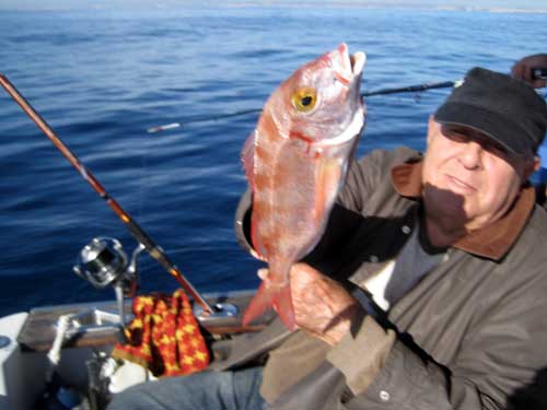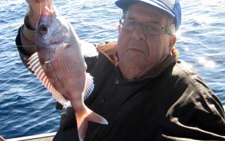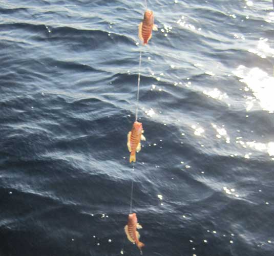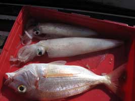 | Arriba a la izquierda una buena mojarra o vidriada . En el centro un pagel de 400 g.. Observe que en terminal del aparejo, colocamos bolitas fluorescentes y plomo rojizo para atraer la atención. A la derecha el patrón con un pargo de mas de medio kilo |