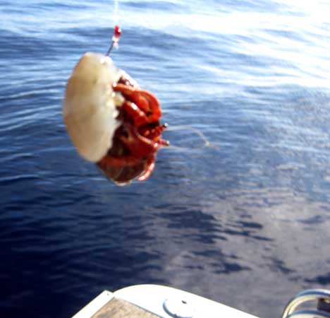 Abajo presento, una verdaderamente excepcional y casual captura . Pescando con langostino, y cuando ya nos quedaban pocos ermitaños, y con el pagel comiendo, mi sorpresa fue que al izar el aparejo, prendido de un trozo de langostino ! VENÍA UN ERMITAÑO QUE SE AGARRÓ AL CEBO Y NO SE SOLTO DE ÉL HASTA DEJARLO EN CUBIERTA! Lástima que pese a mi extremada atención e interés , no pude enganchar con él un buen pagel.... El ermitaño que me regaló la mar, cayó preso, probablemente, de algunas pequeñas vidriadas . Bajo, dos imágenes de mi pesca "milagrosa" |