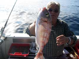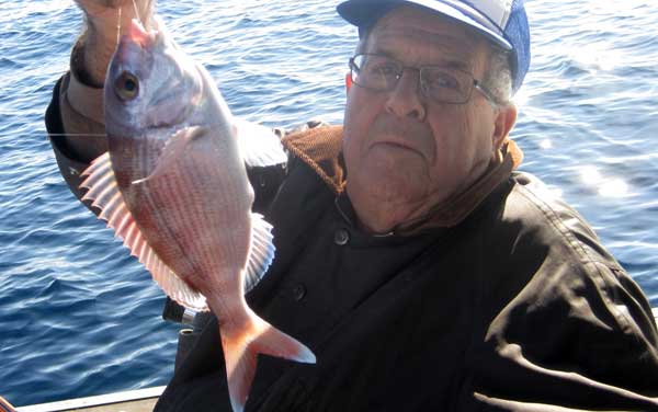 Arriba a la izda , David con nuestro primer pagel de la mañana.Un buen ejemplar de mas de medio kilo de peso. En el centro, el patrón con otro buen ejemplar. A la derecha el otro tripulante, Jaime, con dos pagelones que salieron al mismo tiempo en dos cañas distintas. Se aprecian en todos ellos, las bandas las rojizas y claras, alternando, que presentan, casi todos los peces recién salidos del agua, a causa del stress.Pulsen imágenes para ampliar