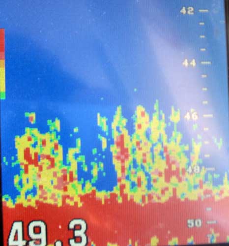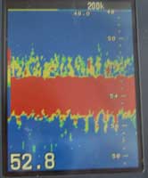 | Pageles, pargos y vidriadas . Bajo una modesta pesquera hecha a mediados del mes en dos caladeros. Los dos con aparentemente bastante pescado en sonda y con vegetación sugerente. En el primero, a la izquierda, el exceso de morralla nos impidió capturar mas pageles. En el 2º logramos algun pargo chopas medianas y vidriadas . Pulse imágenes para ampliar |