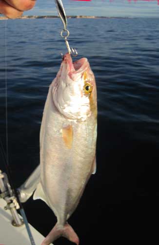 | A la derecha seriola o lecha, segun acepcion local, pescada al jiggig, con una halco de 40 gr.. En el centro el patrón, con un gallo de 41,5 cm y cerca del kilo de peso. A la derecha: un doblete de chopas de un tamaño de 150 a 250 gr, de los varios que salieron.. Chopas que se mostraron muy activas en la primera hora de pesca, en aguas del Carrilón. |