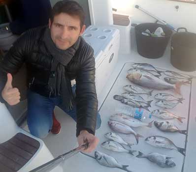 | Como todos los años , por estas fechas, y en caladeros tradicionales, se estan haciendo algunas buenas pesqueras de doradas. Muestra de una de ellas, son las imagenes que incluyo . Una de ellas de pageles y doradas, de tamaño mediano y algunas mayores, remitidas por un buen amigo. La publico, porque pese a su abundancia, no sobrepasaron el cupo de 5 kilos por pescador y dia, como es lo preceptivo |