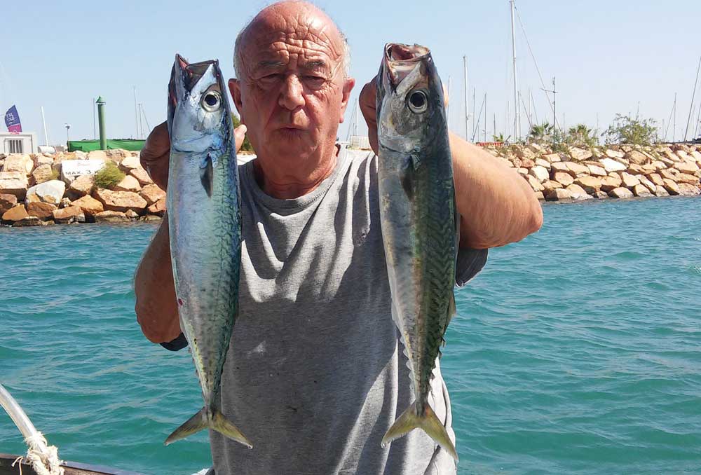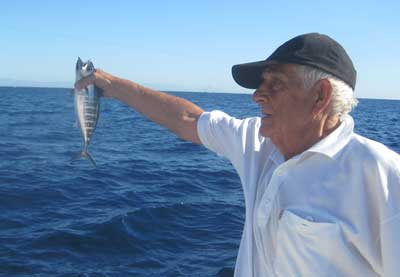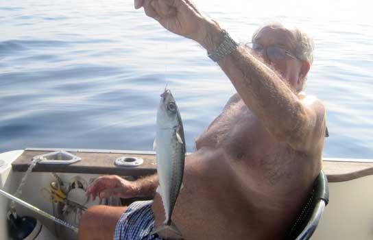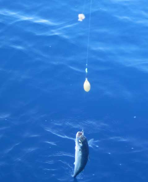 Asi lo hicimos, una vez fondeados, con los primeros claros del día, pescando además, con tres cañas con anzuelo pequeño para conseguir vivos. Pronto, en la sonda, vimos imágenes de manchitas rojas densas y aisladas que indicaban probablemente la presencia de sorelas o caballas. Iniciamos, alguno de a bordo esta pesca, cebando nuestreos anzuelos con trozos de sardina y /o langostino.