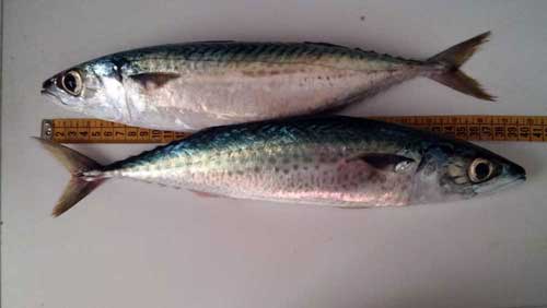 Muchos pescadores confunden al estornino (también llamado por los pescadores tonino) con la caballa que es más listada y el estornino más moteado . Vea bajo un ejemplar de caballa y un estornino en una foto de archivo