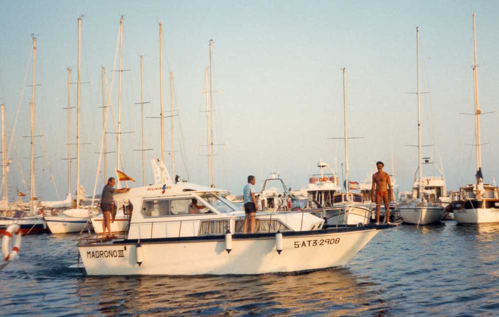 | Bajo: algunas de las embarcaciones del autor a lo largo de su vida de pescador y una de sus capturas : Una gran aguja imperial |