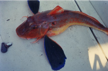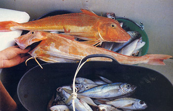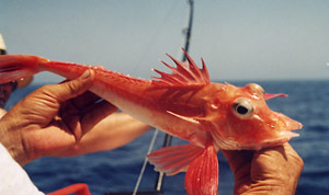 Hacemos unas fotos del momento. Ya a bordo el pescado, Manolo sonríe de oreja a oreja. El nombre local de chirriola corresponde a la lucerna bejel o colorado (Trigla Lucerna), ejemplar de la familia de los tríglidos o rubios que entre otras características (como es la trasformación de las primeras aletas ventrales en patas muy sensitivas e incluso gustativas) tiene la facultad de emitir sonidos al hacer vibrar su vejiga natatoria. Vea bajo otrasdos variedades el graneoo escacho (Trigla Lyra) y a la derecha el rubio o Trigloporus lastoviza