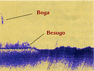 Al estar ya cerca vemos en la sonda una mancha de pescado correspondiente, como luego comprobaremos, a bogas y jureles y quizás incluso a alachas. Es preciso seleccionar bien la mancha eligiendo prioritariamente la pegada al fondo, la que solo se eleve del mismo 5 o 6 metros , para tratar de evitar así las molestas bogas. Balizamos a continuación el pesquero y nos fondeamos.