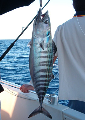 El llamado bonito del norte o albacora (thunnus alalunga) no tiene nada que ver con este. Se le captura también en el Mediterráneo a unas 30 o 40 millas de la costa. Su característica mas notable es la enorme longitud de sus aletas pectorales que alcanzan su segunda dorsal. Ponemos de nuevo proa al sol y al poco es la caña fina la que se arquea y empieza a soltar línea Esta vez trabajo yo el pescado. Ajusto el freno y empiezo a cobrar. La caña se curva y la chicharra del freno suena con estridencia. El pescado busca la profundidad pero poco a poco lo acerco. Es un joven atún de unos 800 gr. He tenido la precaución de sustituir la potera que llevaba el pequeño calamar rojo, por un simple anzuelo, por lo que no daño casi su boca. Con gusto lo devolvemos a la mar, deseando que dentro de 7 u 8 años se haga un buen mozo de 80 a 90 kilos. Mas tarde y en una zona marcada por el averío de pardelas, charranes y gaviotas, localizamos un pequeño banco de bacoretas cebándose en superficie. Conseguimos unas cuantas. Su característica mas notable es la presencia en el dorso de unos dibujos sinuosos algo semejantes a los de la melva, pero además presenta en su zona pectoral 5 o 6 manchas oscuras muy típicas.