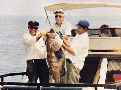 | Arriba lo que incialmete tomamos por una gran cherna y que despés comprobamos que era un mero denton de cerca de 30 kg. La foto de la derecha está fechada en julio del 90 |