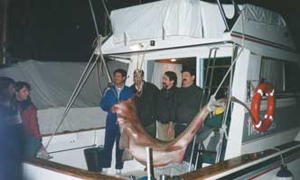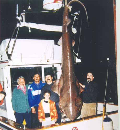 La alegría reina a bordo, pues puede que el sitio esté “virgen” y nunca haya bajado aquí un anzuelo. Félix lleva de nuevo el barco al sitio marcado previamente en la pantalla del plotter del G.P.S. para intentar derivar hacia el mismo sitio. Calan de nuevo las dos cañas. Al acercarse de nuevo, según indica la sonda, casi arriba del cantil submarino, una fuerza increíble tira de la línea del carrete haciéndole perder sedal rápidamente al tiempo que la caña se incurva peligrosamente. No es un enroque pues la deriva del barco es ahora muy lenta. Aflojan algo el freno del carrete para que no se rompan ni el sedal ni la caña, y el pescado hace una larga salida en la que se lleva mas de 300 metros de línea. Llega un momento en el que el pescado que se debate en el abismo de las profundidades marinas, parece que se cansa por lo que Félix aprieta algo el freno del carrete. A veces este patina pero poco a poco va cobrando sedal, ayudándole manualmente el pescador. Las salidas de línea y la lenta recogida se alternan, pero poco a poco aquel tremendo animal es izado del fondo. A bordo no tienen prisa. Es muy importante que el pescado al que suponen una enorme cherna llegue muy fatigado. Pronto se dan cuenta que debe ser otra cosa, por la gran resistencia que ofrece. En este momento el bicho tira inconteniblemente hacia abajo y mas cien metros de línea, ya recuperada, es cedida de nuevo. El tiempo pasa rápidamente. Llevan ya dos horas de lucha. Ahora si que notan señales de cansancio en aquel animal. La caña sigue hecha un arco pero el carrete ayudado por Felix recoge línea de una manera regular llenando esta poco a poco el tambor del mismo. Cuando faltan 15 o 20 metros , Pepe asomado por la borda exclama: -¡Madre mía!.¿ Que es eso? ¡Es enorme! ¡Si es un tiburón..! Eduardo impone la calma. Prepara dos bicheros previamente amarrados a puntos firmes de la borda. Se calzan Felix y él unos guantes Abre la portezuela de popa y pasa a la platafoma de baño. Felix aguanta como puede las tarascadas del bicho que ahora junto al barco se revuelve. Hábilmente Eduardo le clava con decisión el primer bichero en su amenazadora boca abierta y lo cede a Ignacio. En este momento el tiburón se revuelve y hace saltar espuma junto al barco. Eduardo toma el segundo bichero que le da Pepe y lo clava donde puede, cerca de la boca. Están asombrados. Es distinto a todos los tiburones que conocen marrajos o tintoreras comunes en el Mediterráneo. Posteriormente Félix averigua que se trata de una cañabota, un tiburón de profundidad, pariente próximo del boquidulce. Tiene los ojos verdes, una única aleta dorsal muy cerca de la caudal, y unos dientes en la mandíbula inferior característicos en forma de peineta. Tiene además 6 hendiduras branquiales en vez de las 5 habituales en las demás especies de tiburones. Aún pescan un rato más cuando el bicho se queda inmóvil y ellos se tranquilizan, consiguiendo otras chernas . Ya es tarde, por lo que ponen rumbo al puerto. Anuncian su llegada para que un camión lleve la enorme cañabota a la nevera. Atracan ya de noche pero hay gran expectación en el muelle. Fue sin duda un récord mediterráneo en su clase y en esta pesca ya que la enorme cañabota pesó 250 kilos.Años despues, en un concurso de pesca lograron a bordo de otro barco la cañabota mas grande que se ha logrado en Torrevioeja y que aún es récord local de pesca recreativa. Ver mas abajo