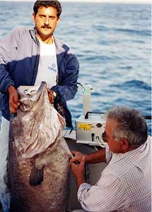 La tecnología actual ha puesto al alcance del pescador deportivo metas que eran impensables hace años. Bien es verdad que es preciso además, para lograr aquellas, cierto espíritu innovador - y diría que aventurero -, dispuesto a investigar lo desconocido, aún a costa de molestias y fracasos. En este momento es Félix el que cree que ha clavado algo. Eduardo toma la línea en sus manos y asiente: -¡llevas uno muy gordo!- asegura. Félix nota claramente los tirones de un animal que se debate allá abajo a casi medio kilómetro de profundidad. Pone en marcha el carrete y pronto la caña se curva en un arco. De vez en cuando patina el embrague y cede línea al tiempo que la caña cabecea con violencia. Cuando faltan pocos metros el sedal se aparta del barco y a unos 15 metros se ve salir una gran burbuja de aire y al poco la tripa blanquecina de una enorme cherna asoma en la superficie. Se agita algo intentando nadar hacia abajo pero la brusca descompresión la tiene aturdida y la hace flotar. Con cuidado la atraen al costado del barco, le meten un bichero por su gran boca abierta y la engarfian. Abren la portezuela de la popa del barco y a través de ella de ella la meten a bordo. !Es tremenda, tiene por lo menos 35 o 40 kilos! –asegura Eduardo-.