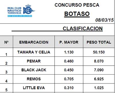 El día 8 de marzo se celebró este Concurso de Pesca fondeada, llamada localmente "del botaso" Se inscribieron 11 embarcaciones, de las cuales presentaron capturas 5, debido a que el tiempo resultó peor de lo previsto unos días antes, y a media mañana, sopló un levante de fuerza 4, con rachas de 5 que obligó a algunas embarcaciones a volverse a tierra Una de las características o condiciones (positivas para mí), añadidas a este Concurso, es la obligatoriedad de que los peces presentados al peso, tengan mas de 20 cm para ser computables. Ya que como digo en otra pagina de esta web, los tamaños minimos aceptados por la Comunidad Valenciana no son en algunas ocasiones, los lógicos (por la talla en la que se reproducen) ni tampoco se ajustan a los vigentes en la Comunidad Europea. Vea AQUÍ Pese al mal tiempo , hubo capturas de calidad y abundantes-especialmente a bordo de la1ª embarcacion clasificada-, como puede ver en las imágenes que incluyo , que me han sido remitidas amablemente por Elena del R.C.N.T. y los organizadores de este evento |