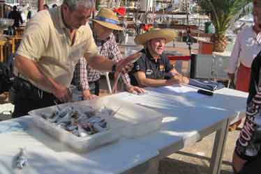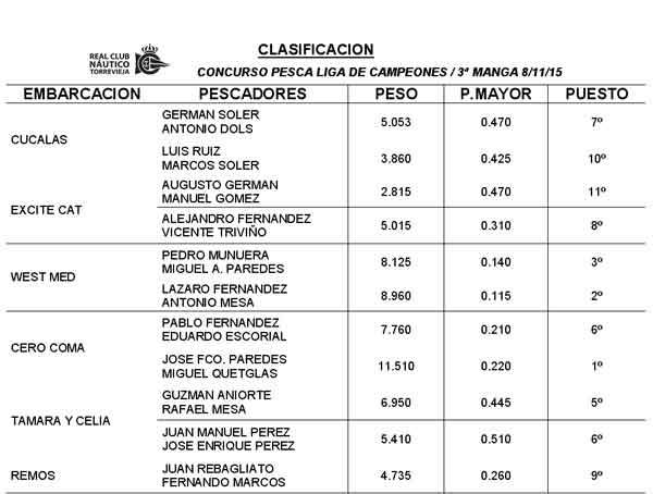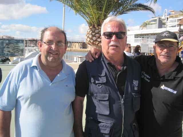 | Esta tercera manga de la Lga de Campeones, se celebró el dia 8 de noviembre del 2015. Participaron 11 equipos de dos pescadores cada uno, todos de este R.C.N. de Torrevieja, a bordo de 6 embarcaciones. Una vez celebrado el conjunto de esta Liga de Campeones, los vencedores participarán en 3 campeonatos de liga nacionales Se pescó a unas 5 millas al N.E de Torrevieja, en unos 40 m de sonda, en los pesqueros conocidos como la 1ª de Levante y la 2ª, también llamada, esta última , Cul de Coves. El pescado como verán, salvo unos cuantos pageles de 400 a 500 gr, fue de promedio pequeño: chuclas , besugos aligotes, raspallones, vidriadas, no computando ni jureles ni bogas .(Pulsen imágenes para ampliar) |