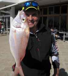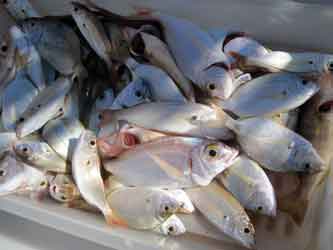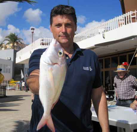 | Bajo, dos de los mejores pageles. A la izquierda, la pieza mayor, un pagel de 510 gr, pescado por J.M Pérez a bordo del TAMARA Y CELIA. A la derecha otro pagel, éste de 425 gr ( aunque parezca el mayor) logrado por Luis Ruiz a bordo del CUCALA | ||