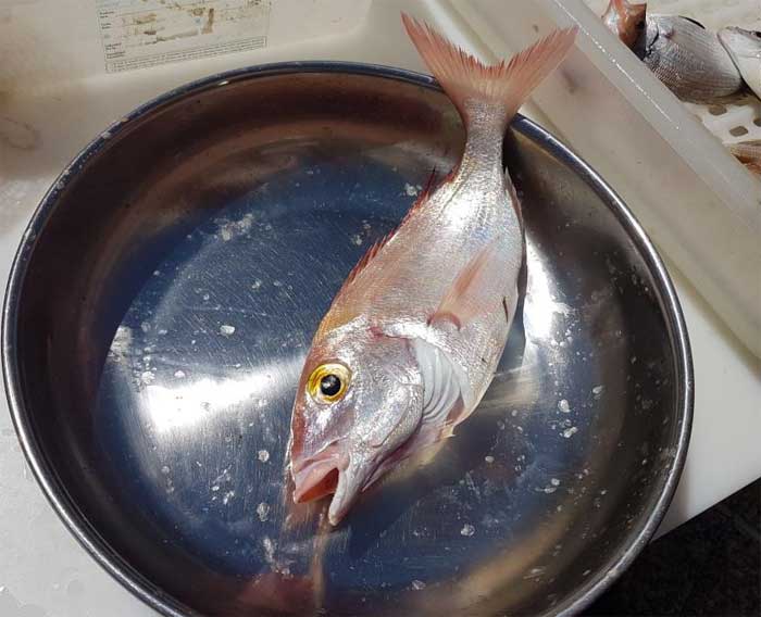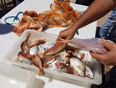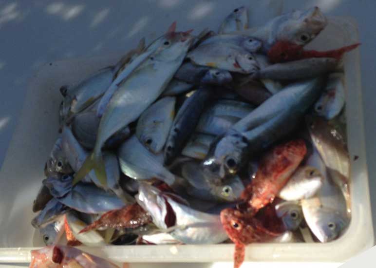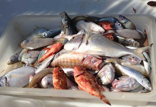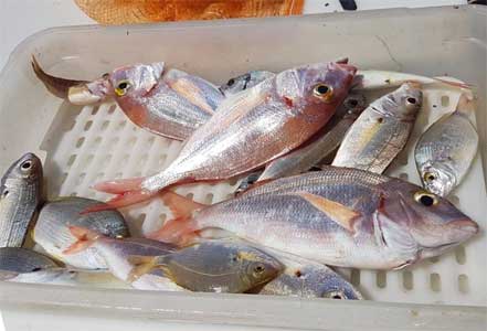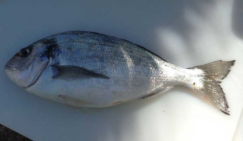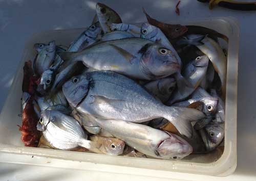 | Pageles, raspallones vidriadas serranos etc fueron las piezas mas abundantes. A la derecha ella pieza mayor, un pagel de 595 gr.capturado por A. Dols |