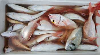 Se clasificaría en segundo lugar la embarcación AVIZOR , patroneada para Jose Manuel Medina.que hizo también una extraordinaria pesquera de 17 kg de pagel (ver bajo). En primer termino a la derecha uno de sus tripulantes Manolo Ruiz, excompañero de tantas pesqueras a bordo del añorado Chambel.