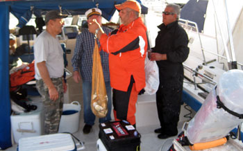 ![]() Llegada de la embarcación Josper. Uno de los tripulantes , del equipo francés, comprueba sus capturas que sobrepasaban los 7 kg |