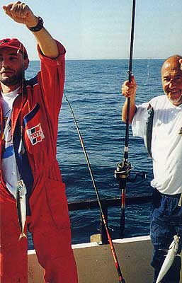 Mis compañeros se valieron de otros trucos, como el del cronometrado del tiempo de caída del aparejo, o el tanteo cada poco tiempo del descenso del mismo, moviendo éste alternativamente arriba y abajo hasta notar la picada. El marcaje de la línea con la pequeña tira de plástico blanco, me hizo controlar mejor la banda de pescado que aparecía en la sonda y del modo que lo hice no entorpecía la libre salida de la línea. Un poco antes de llegar mi aparejo a la profundidad marcada, interrumpía bruscamente la caída del plomo, para soltar la línea con igual brusquedad a continuación. Estas sacudidas estimulaban por lo que se ve el acoso de las caballas. De todos modos hay que decir que son peces muy voraces y confiados y si había en su zona algun anzuelo cebado, la pesca continua estaba asegurada. En el mismo estrato o profundidad en la que estaban, había también jureles y un poco más profundamente era el dominio de las bogas.