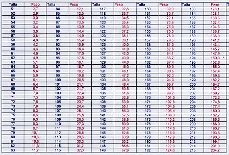 | Tabla moderna confeccionada con el estudio de miles de atunes publicada por el I.O. de MÁLAGA |