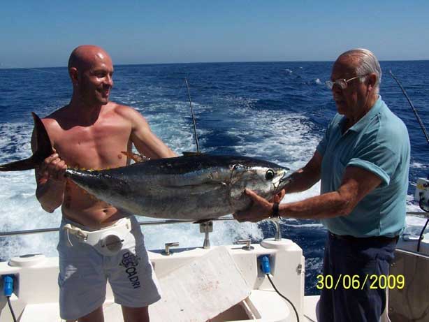 Mi barco fue el primero en conseguir una picada de un atun de unos 18 kg de peso. Una vez arriba, dimos la vuelta y conseguiimos 3 picadas a la vez.