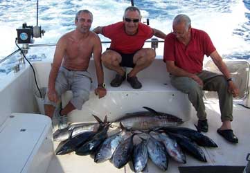 Eusebio y Felipe, aún no habóian tocado nada. Felipe me preguntó que aparejo llevaba. Le contesté que los mismos que llevaba cuando pescamos juntos frente a Águilas . Me djo que no se lo explicaba ( pues estaba usando los mismos) y cuando nosotros llevábamos 12 picadas, el me dijpo que acababan de sacar el primero.Continuaron las picadas, y cuando llevábamos 10 atunes arriba, les dije a los compañeros que ponía rumbo a Santa Pola.