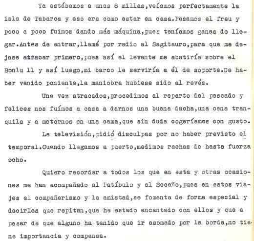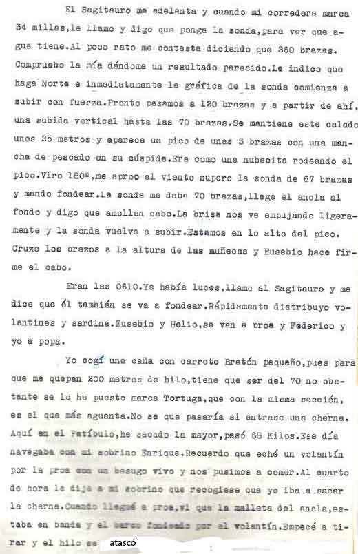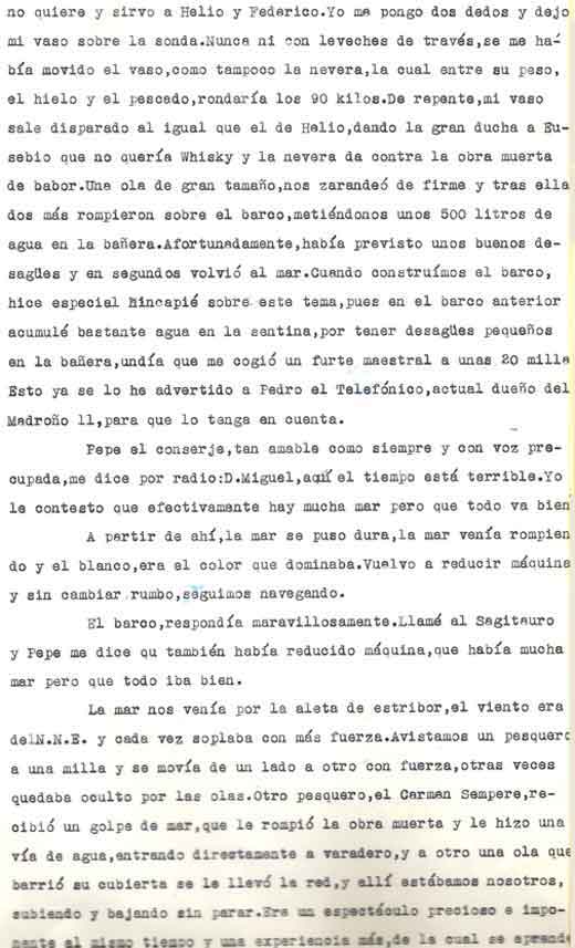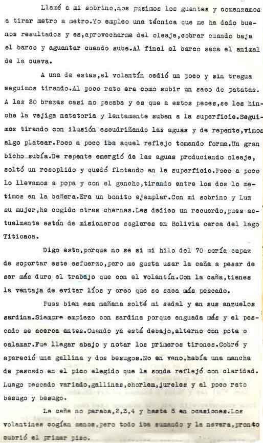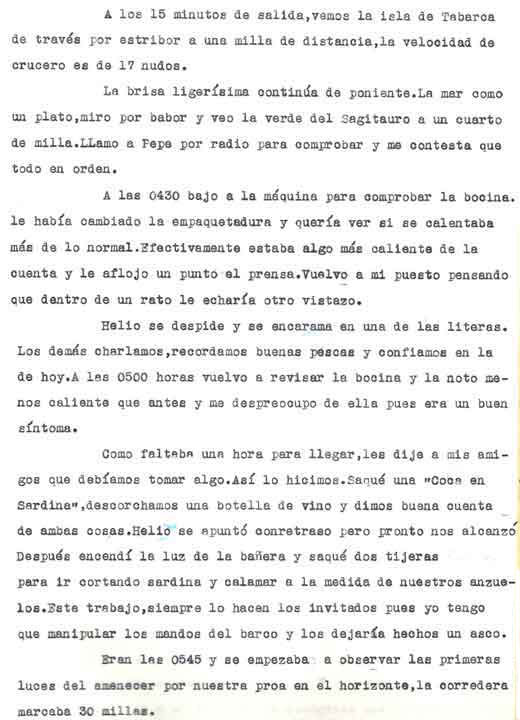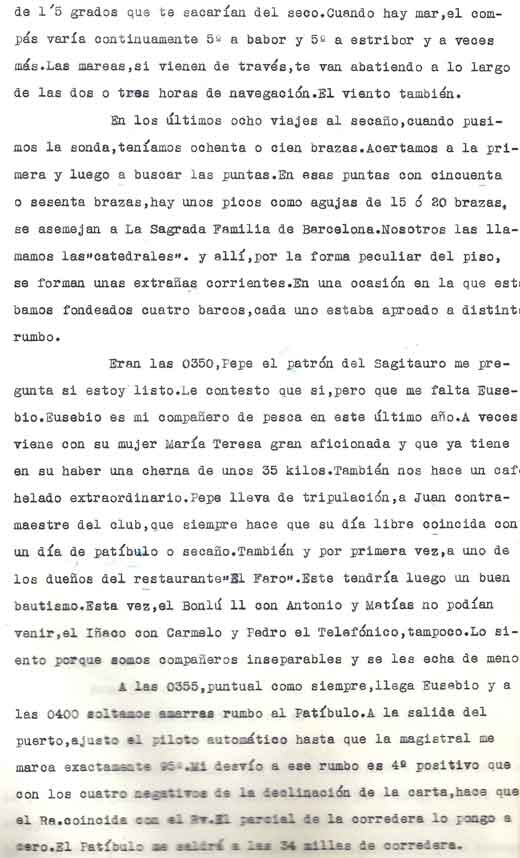 | A modo de presentación Miguel Cuervo Arango es de sobras conocido en el mundo empresarial y deportivo de nuestra zona y también conocido ya a traves de estas páginas por lo que no voy a hablar de él Si que quiero justificar la presencia de este artículo en esta web . Está escrito por un veterano pescador, en unos tiempos en los que el llegar a caladeros como el Patibulo o el Seco, situados a mas de 30 millas de la costa con ausencia de los medios de localizacion por GPS o Loran, aún no aparecidos, era una verdadera aventura, no exenta incluso de dos riesgos importantes: Uno, no dar con el caladero despues de 5 o 6 horas de navegación . El segundo sufrir las consecuencias de unos partes metereologicos no tan perfeccionados como los actuales. Si ahora tampoco son seguros al cien por cien, hace 30 años lo eran mucho menos. No era raro (y yo lo vivi personalmente), ir por ejemplo al Seco descde Torrevieja , distante de aqui 36 millas, con barcos que navegaban a 7 a 8 nudos, y despues de amenudo 5 horas de navegación, volvernos "bolo" por no encotrar el caladero, (por navegar tan solo con ayuda del compás y sonda), o tenerse que volver precipitadamente por mal tiempo. Pienso que por ello y por la prosa interesante y apasionada de este veterano, que el artículo que hoy les presento, puede ser de interés para veteranos o pescadores que se inician ahora en este deporte. Disculpen el formato del mismo . He querido respetar lo mas posible el original. Muchas gracias |