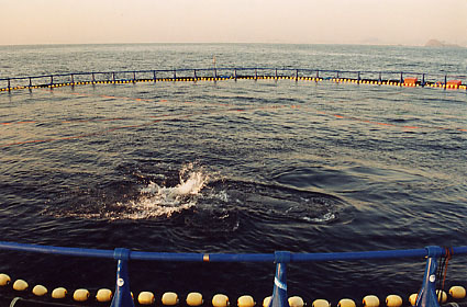 mediante redes de cerco, y transportados hasta sus lugares de engorde