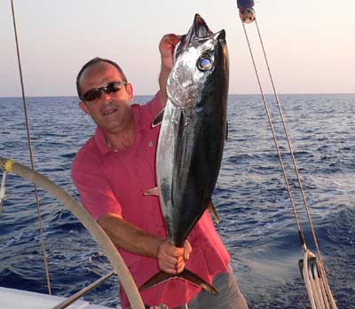Habíamos pescado ya alguna albacora de 5 o 6 kilos entre Mallorca y Menorca, entrando la mayoría a nuestro gran señuelo Laserpro y alguna a la pequeña rapala pero nuestra ilusión era conseguir algún atún de los que pueblan en estas fechas las aguas del mar de Cerdeña.