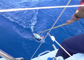 Aún capturamos antes de llegar a Cerdeña 4 albacoras de 6 a 9 kilos. Nuestra nevera estaba a tope, por lo que el Capi abrió alguna albacora y la puso a salar, para posteriormente, colgarlas al sol y al viento de los estays y obenques.