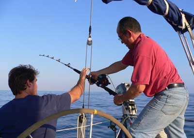 Una vez calados los aparejos pusimos las cañas alojadas en sendos cañeros, no sin antes asegurarlas, mediante un pequeño cabo y mosquetones, al estay de popa.