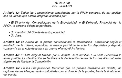 Como se deduce de lo expresado en el artículo 45 las capturas de las mangas serán custodiadas por el Jurado hasta la finalización del pesaje. Tampoco de la lectura de este texto se deduce, que las capturas pasan a propiedad de los organizadores, ni se les autoriza, con esa normativa, a elegir las mejores capturas para llevárselas de las localidades donde se organizan los Concursos.
