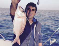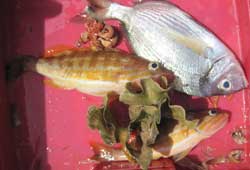 | Arriba, En el centro, el patrón Jose Luis, con uno de los muchos pargos que entraron a los ermitaños. A la izquiera Antonio con un pagelón de medio kilo. A la derecha con otro pargo |