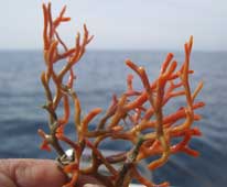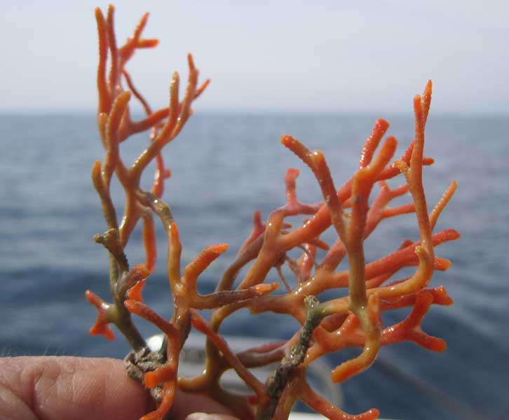 parecido al coral asta de ciervo. Según el biologo del Excmo Ayuntamiento de Torrevieja J.Antonio Pujol, y otros biólgos consultados, es un falso coral siendo realmente el Myriapoda truncata (briozoo) aunque es cierto que tiene una forma alargada poco habitual.Dice que para determinarlo correctamente tendrían que examinar el ejemplar y mirar ciertos rasgos anatómicos. El de la foto es mucho mas frágil que el coral auntentico.por eso no es raro enganchar algun trozo con el anzuelo. -También sería un briozoo el organismo situado a la derecha, debajo del serrano .