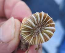 La foto del centro es realmente un coral. Creemos- dice J.A. Pujol y otros -que pertenece, como ya me adelantó, al género Caryophyllia (probablemente Caryophillia inornata), pero también podría pertenecer al género Balanophylla. También se haría preciso un análisis bajo lupa de ciertos caracteres anatómicos. Ver abajo otra imagen del mismo, tomada de http://skaphandrus.com/, en el fondo del mar.
