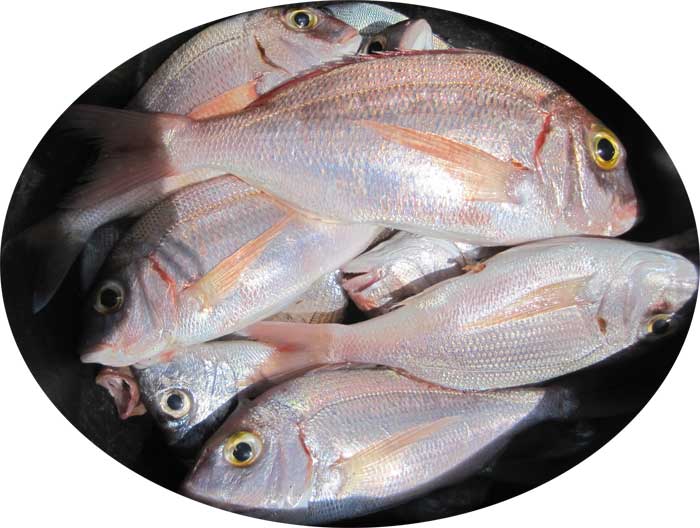 Arriba a la izquierda un doblete chopas de tamaño mediano . A la derecha parte de pageles y pargos que nos tocaron a cada uno |