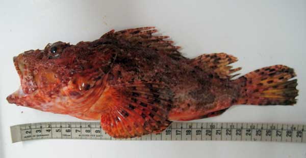 | Arriba a la izquierda, vidriada o mojarra. En el centro lo que parece una gallina o cabracho, pero es una rascasa de 400 gr y 28,5 cm (tamaño máximo 30) (Pulse imagenes para ampliar) . A la derecha , escórpora .Fíjense el tamaño del ojo, su posición en la cabeza y la escotadura craneal detrás del ojo |
