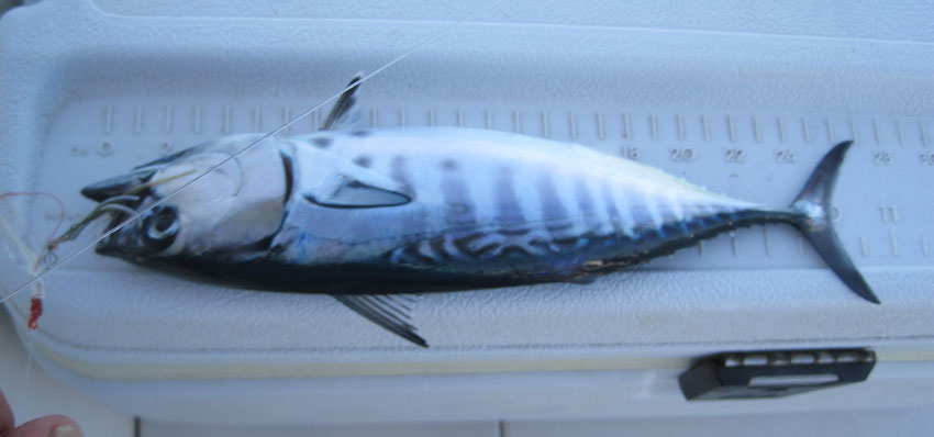 Los bonitos tienen un tamaño medio entre 300 o 400 gr y los 600 o 700, siendo las bacoretas del año mas bien pequeñas , de unos 200 a 300 gr.o menos. Se empiezan a coger algunos atunes pequeños que todos los buenos aficionados, volvemos al mar