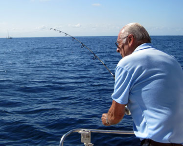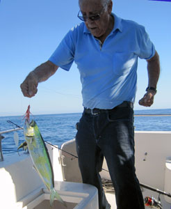 Miguel luchando con una buena pieza, que resultó ser una lampuga de cerca de 3 cuartos