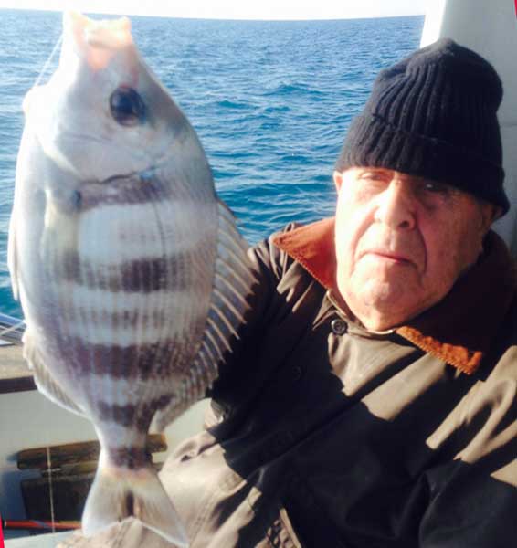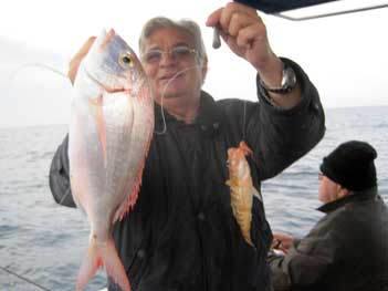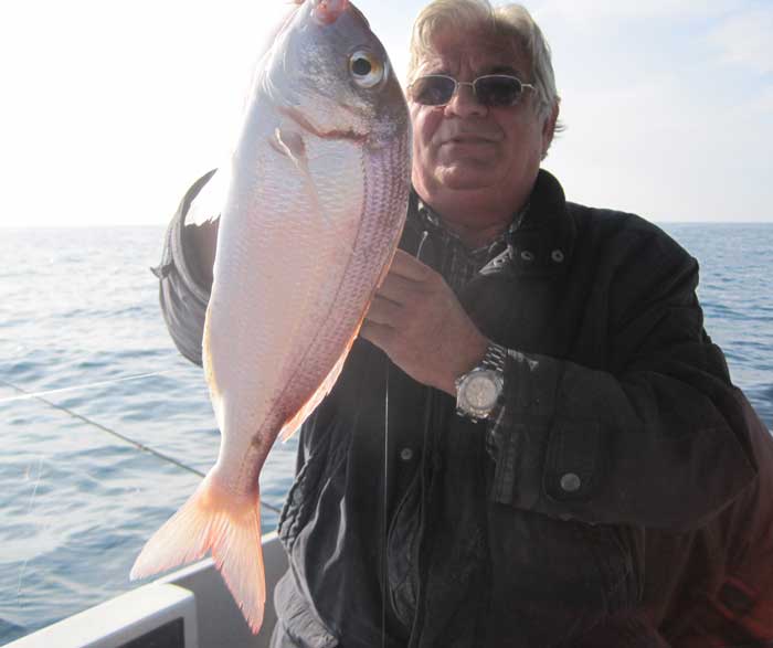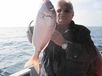Posteriormente, atacaron de verdad los besugos aligotes, que daban cuenta rápidamente del langostino que llevábamos de cebo, e incluso de los ermitaños. Por ello, dejamos cabo para salirnos de la "mancha"; pero fue inútil, ya que rápidamente nos siguieron los besugos. Por lo que hicimos una "enmendá" como llaman en Torrevieja, yendo a otro sitio cercano, también querencioso de pageles.