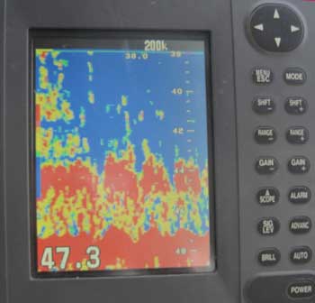 Ese día, a mediados de enero, a bordo del GINTONIC, decidimos ir a un sitio querencioso de pageles. Al llegar encima del pesquero, nos encontramos la sonda atestada de pescado. Sabíamos que en la zona, aparte de pageles, también había aligotes, que podrían estorbar con su voracidad, la pesca de pageles, pero podría haber también calamares. Por ello, nos fondeamos para probar.