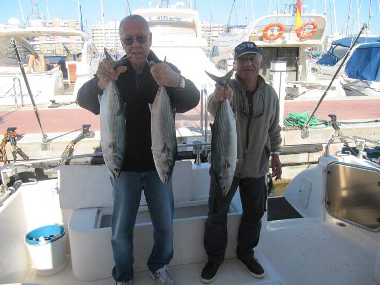 Hacía años que no sabíamos uno de otro, y tuvo la gentileza de acceder a mi solicitud de que me enviara las fotos de alguna de sus capturas recientes.Precisamente ese día, a primeros de enero, salia al currican costero, en una zona frente a las costas de Santa Pola y Alicante. Fruto de esa salida fueron varias picadas al amamecer y las capturas, de estos buenos ejemplares de bonitos ya casi al mediodia, hora que tenía que regresar a puerto