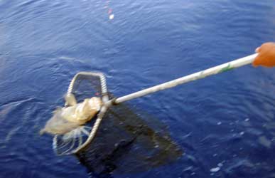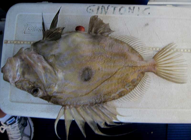Una vez llegado al pesquero y fondeados con precisión en la mancha elegida, (con ayuda de nuevo de la baliza), al poco, en su primera calada, emoción a bordo, pues el patrón había clavado algo gordo que se resistía tenazmente a dejarse subir. Tras unos minutos de faena y ansiedad, resultó que ¡era un "gallo pedro"que sobrepasaba en tamaño nuestro gran salabre. Ver bajo |