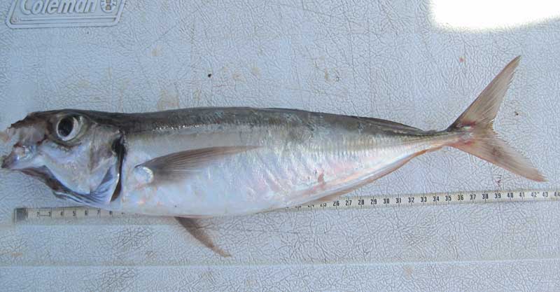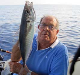 | Había mucho pescado, sobre todo besugos de la pinta, (pagellus boraveo) mas bien pequeños y muchos jureles alguno de los cuales como el que muestra Jose Luis, estaba por encima de los 3 cuartos y de una talla de 44 cm. |