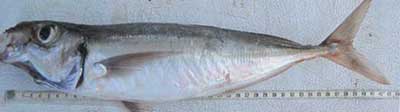 A la derecha, arriba, el que cogimos,(con el morro roto al descolgarse ya a bordo), es el jurel blano o trachurus mediterraneus . Bajo de él, (foto M.Arias) jurel negro o chicharro trachurus trachurus. El jurel blanco según Wikipedia, tiene