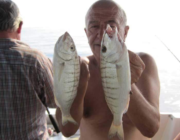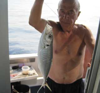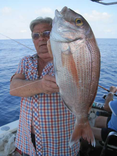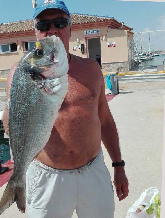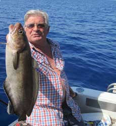 | Bajo, Antonio, nuestro veterano compañero de tantas pesqueras, con una buena gallina o cabracho |